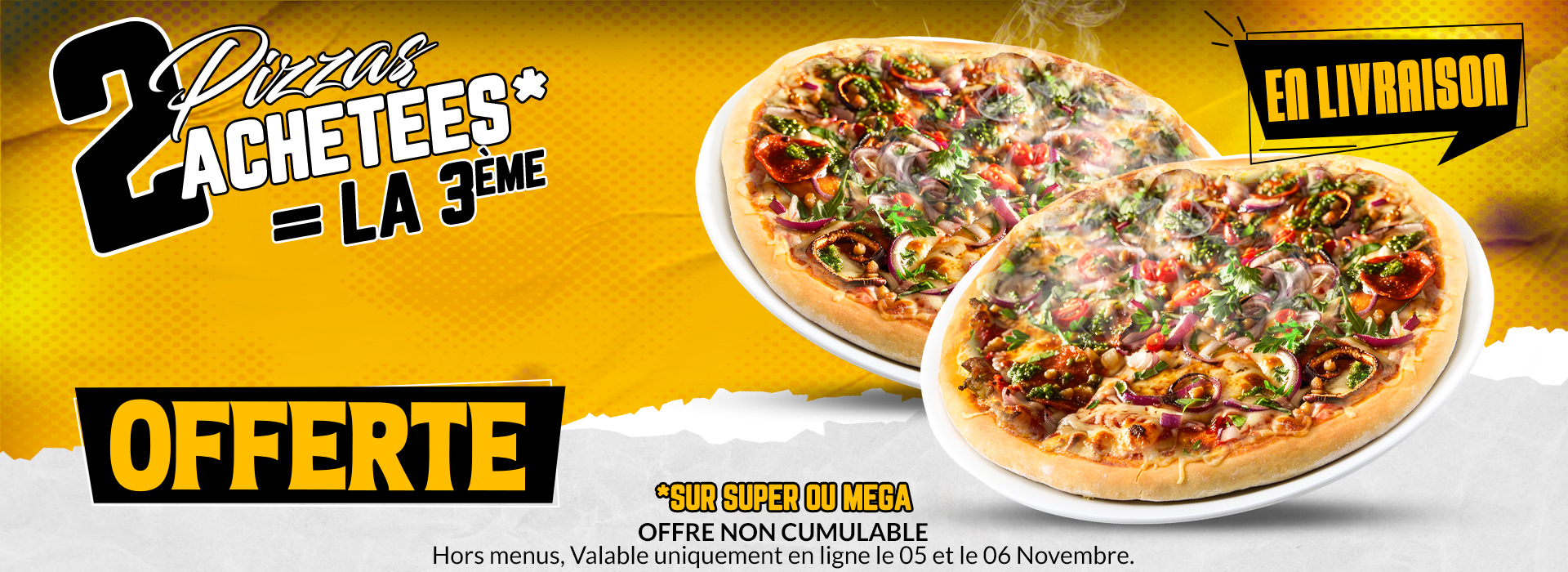 1 Pizza SUPER ou MEGA achetée = la 2ème Offerte